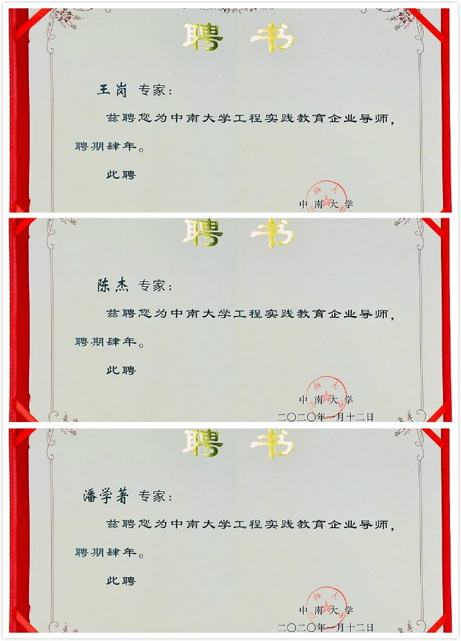 在現場,李勁風副院長代表學校向陳杰、潘學著、王崗三位技術負責人頒發了工程實踐教育企業導師聘書。在未來的四年里,他們將以實踐導師的身份幫助學子將理論知識在企業實踐中淬煉。值得一提的是,公司三位技術負責人都曾先后畢業于中南大學,這次出任為導師,既是校企對接,也是學長對學弟學妹們的真誠傳幫帶。