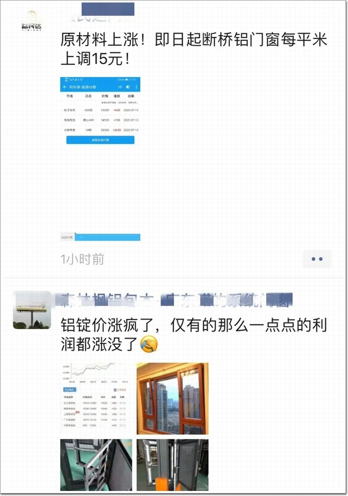 很多行業從業者吐槽,這種漲法讓我們門窗(詞條“窗”由行業大百科提供)幕墻行業的人扛不住啊!下面是一些刷屏的截圖,我們來看看聊了些啥吧!
