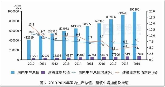 2019全年全社會建筑業實現增加值為70,904億元,比上年增長5.6%,增速上升了0.8個百分點。建筑業增加值增速低于國內生產總值增速0.5個百分點。2019年,建筑業增加值占國內生產總值的7.16%,較上年上升了0.04個百分點,達到了近十年最高點。建筑業作為國民經濟支柱產業之一,地位依舊穩固。