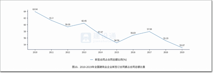 本年新簽合同額占簽訂合同總額比例為53.07%,比上年下降了2.12個百分點,連續兩年出現下降。