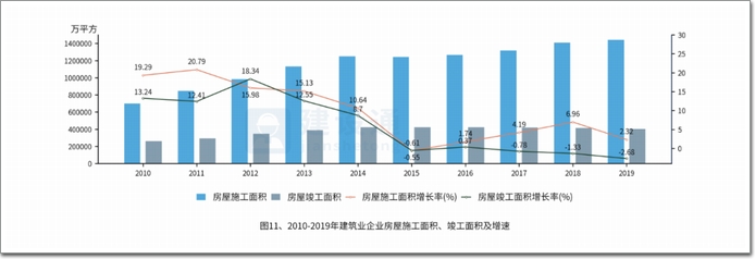 房屋施工面積增長,竣工面積連續三年出現下降,全國房屋竣工面積中,住宅占比最重,接近七成。2019年,全國建筑業企業房屋施工面積達144.16億m2 ,增速為2.32%,比上年減少了4.64個百分點。2019年,全國建筑業企業房屋竣工面積40.24億m2,較上年下降2.68%,連續三年出現負增長。