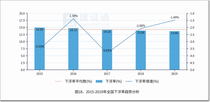 近五年全國下浮率持續下滑。2015年至2019年,平均下浮率為14.26%。2019年,全國下浮率為13.66%,比上年降低了1.49%,降幅為0.59%。