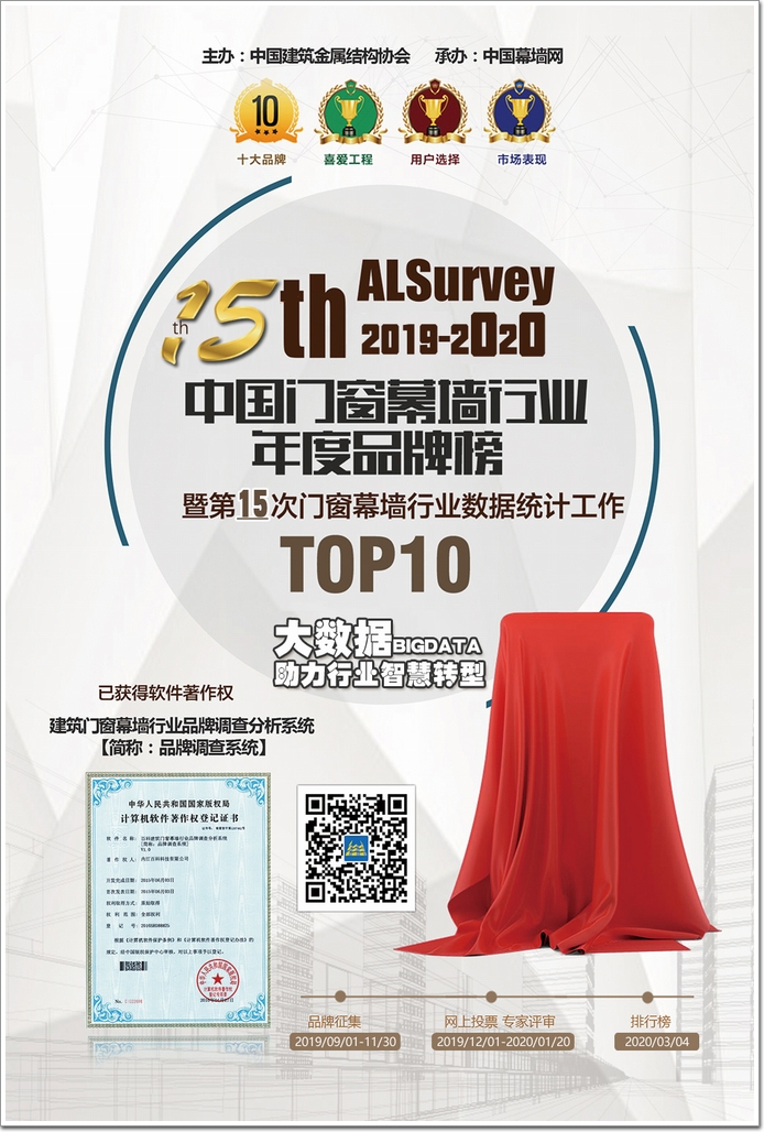 打造全產(chǎn)業(yè)鏈體系,為高質量發(fā)展賦能!堅持綠色環(huán)保、可持續(xù)發(fā)展,堅持工匠精神,遴選出最優(yōu)秀的行業(yè)品牌企業(yè),成就行業(yè)真正的“TOP10”,堅持走品牌化之路的企業(yè),由中國建筑金屬結構協(xié)會(詞條“中國建筑金屬結構協(xié)會”由行業(yè)大百科提供)主辦,中國幕墻網(wǎng)承辦的“2019-2020年度第十五屆AL-Survey門窗幕墻行業(yè)年度大型讀者調查暨‘我最喜愛幕墻工程’評選活動”(以下簡稱“AL-Survey”)為您推送!于2020年8月12日,在廣州南豐國際會展中心隆重舉行了頒獎儀式。