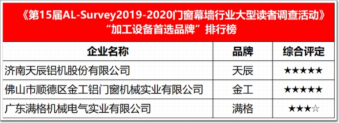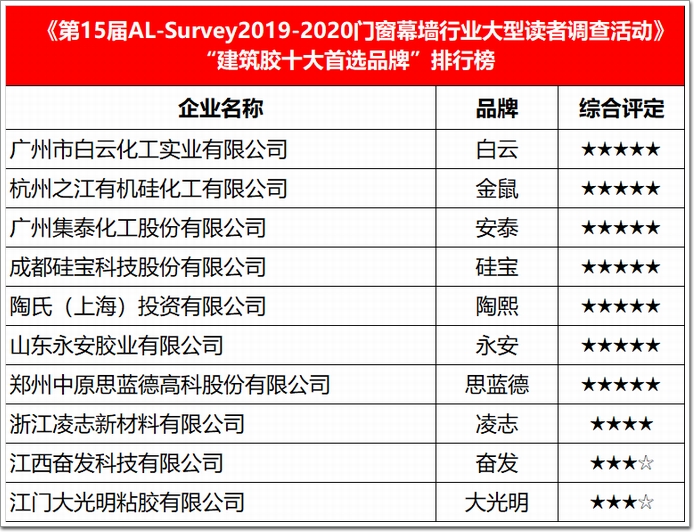 AL-Survey組委會按照歷年來通行的評價體系(網(wǎng)上投票占70%,專家評分占30%),評選出了本屆的“我最喜愛幕墻工程”以及門窗首選品牌、建筑膠首選品牌、五金首選品牌、型材首選品牌、玻璃首選品牌、加工設備首選品牌、隔熱條首選品牌、密封材料首選品牌等八大類獎項,共計73家獲獎企業(yè)(品牌),以及15項獲獎工程。