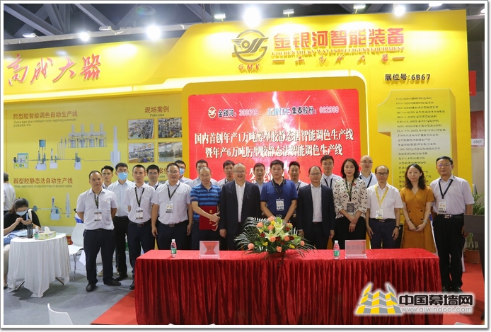 智能化科技項目,轉化成先進生產力|2020年8月13日,在全國,以及全行業,整個產業鏈凝心聚力,共同抗疫,取得復工復產的階段性勝利的今天,建筑門窗幕墻行業及密封膠產業的精英們相聚廣州,在2020年第26屆全國鋁門窗幕墻新產品博覽會現場,舉行“國內首創年產1萬噸醇型膠靜態法智能調色生產線暨年產6萬噸肟型膠靜態法智能調色生產線簽約”儀式。