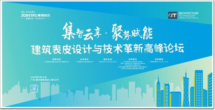 2020年8月14日,由廣州集泰化工股份有限公司發(fā)起并獨(dú)家承辦的——“集智云享 聚勢賦能”【建筑表皮設(shè)計與技術(shù)革新高峰論壇】正式亮相。本次峰會得到了中國建筑金屬結(jié)構(gòu)協(xié)會鋁門幕墻分會、WINDOOR EXPO的大力支持,以及廣東省建筑業(yè)協(xié)會幕墻門窗分會、深圳土木建筑學(xué)會門窗幕墻專業(yè)委員會、深圳市建筑門窗幕墻學(xué)會、蘇州市建筑金屬結(jié)構(gòu)協(xié)會幕墻門窗科技委員會、蘇州市土木建筑學(xué)會幕墻專業(yè)委員會、上海市建筑學(xué)會幕墻專業(yè)委員會的全力協(xié)助,在廣州南豐朗豪酒店隆重舉行。
