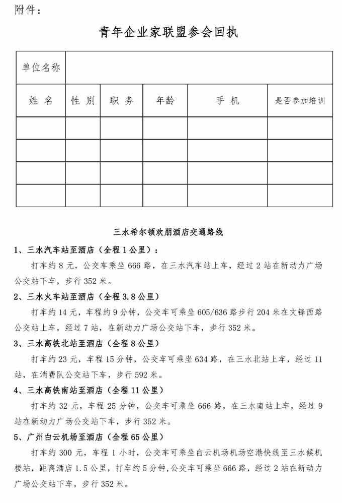 1.交參會(huì)回執(zhí)免費(fèi)參加青年企業(yè)家年會(huì),交通及住宿費(fèi)自理;