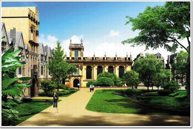 牛津區參考了牛津大學建筑風格,結合以灰色板石為材料的大坡度尖頂、米色萊姆石外墻、草坪里院和回廊,使整個街區都可以感受到猶如知識殿堂般的氛圍。
