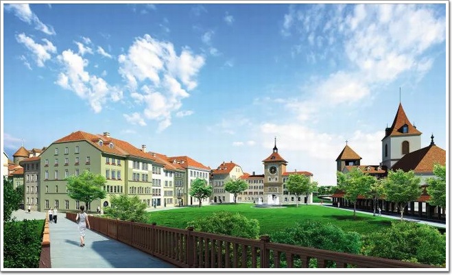 弗里堡從15世紀流傳下來的200多幢獨特的哥特式建筑賦予了這座古城無與倫比的中世紀風格魅力,弗里堡區根據用地起伏、靠近松山湖水域的地理位置特點,結合瑞士極具歷史性的古城和修道院建筑,通過棕紅色瓦斜坡屋頂和綠色砂巖外墻等特征,打造面向湖畔的斜面風景。
