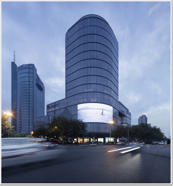 其次,為與流線形的體型相呼應,設計采用豎向線條的盒窗,隨曲線形態(tài)流暢分布,形成端莊動態(tài)的立面風格。裙樓一、二層以通透玻璃幕墻為主。二層以上裙樓與主樓以長條玻璃盒窗作為立面通透單元;實墻部分以開放式干掛青灰色GRC板塊為飾面,典雅純厚,在現代風格中融入江南青磚青瓦的意韻,使建筑與當地文化有神韻的結合。夜晚,在泛光照明的映襯下,裙樓屋頂和主樓屋頂的玻璃體晶瑩剔透,儼然是武林廣場的視覺焦點,整棟大廈看上去,干凈通透,流線性造型十分友好。