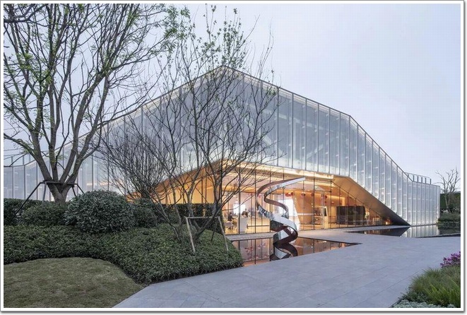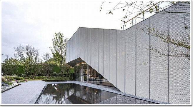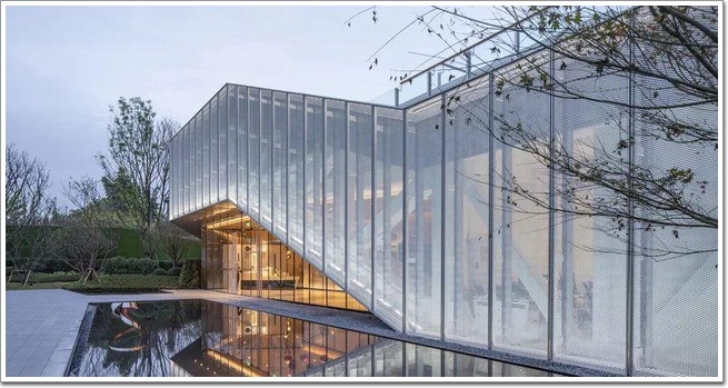 當(dāng)然,對于能享受這個社區(qū)中心的居民來說,第一感觀并不是屋頂,而是周遭的環(huán)境和建筑立面帶來的視覺沖擊,與大部分社區(qū)中心不同,悅來社區(qū)中心的外立面只有很少一部分采用了玻璃幕墻,大部分面積則被一種叫金屬拉伸網(wǎng)的材料所包圍。