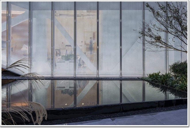 四周環(huán)繞的金屬拉伸網(wǎng)通過折角遮擋了炫光為室內(nèi)空間提供私密氛圍,在不遮擋平行光線的同時還能使室內(nèi)保持通透,與此同時還讓立面產(chǎn)生出空靈的質(zhì)感,而內(nèi)部結(jié)構(gòu)在金屬拉伸網(wǎng)的背后影影綽綽,營造出內(nèi)部和外部虛與實(shí)的朦朧之美。