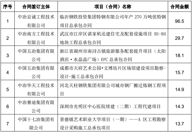 3,中國五冶集團有限公司,浙江省湖州市南潯古鎮旅游服務配套提升項目(太陽酒店·水晶晶廣場)EPC 總承包合同,合同金額 18.1億元