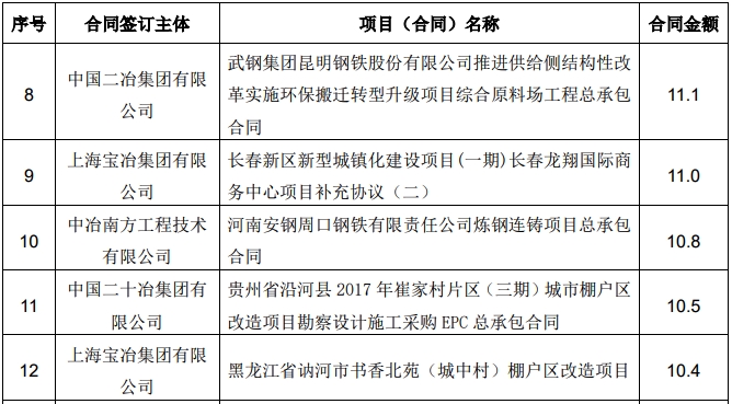 8,中國二冶集團有限公司,武鋼集團昆明鋼鐵股份有限公司推進供給側結構性改革實施環保搬遷轉型升級項目綜合原料場工程總承包合同 ,合同金額 11.1億元
