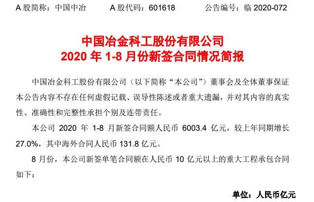 2020年9月14日晚間,中國冶金科工股份有限公司發布2020 年 1-8 月份新簽合同情況簡報。中國中冶2020 年 1-8 月新簽合同額人民幣6003.4 億元,較上年同期增長27.0%,其中海外合同人民幣131.8 億元。