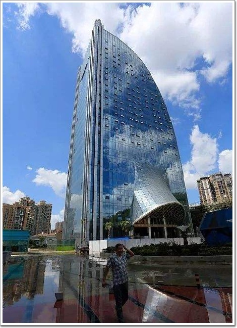 瀑布高樓位于貴陽市觀山湖區裂變廣場(故而大樓又名:裂變大廈),毗鄰貴陽市政府。大樓總高度為121米,大樓外形正面為平面設計,背部呈扇形設計,整個外立面采用全玻璃幕墻鋪設,乍眼看上去跟城市中許許多多的玻璃幕墻建筑一樣,并沒有什么特別。等等,不對,好像大樓漏水了?是水管爆裂?但這水勢也太大了吧。在網友們發出聲聲驚嘆之后,才發現,這原來是一個人工瀑布,知道有開關的,這下網友們可算是放心了……