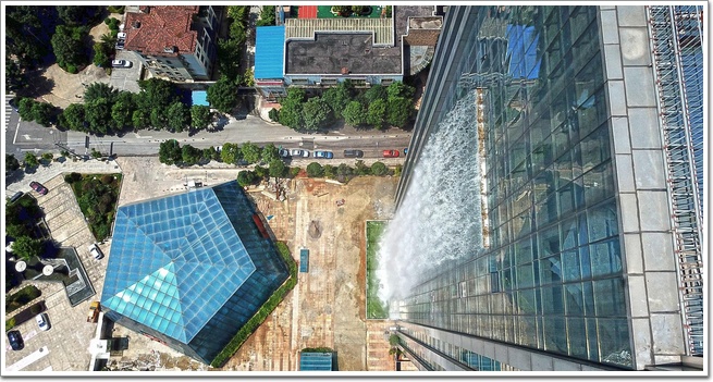 大家都知道,幕墻工程有四性測試,是保證幕墻安全的重要測試,包括氣密性、水密性(詞條“水密性”由行業大百科提供)、抗風壓、平面內變形性能,而作為有著超大水量的瀑布大廈,相信水密性工作一定是做到極致了,否則大樓就該變水災現場了。