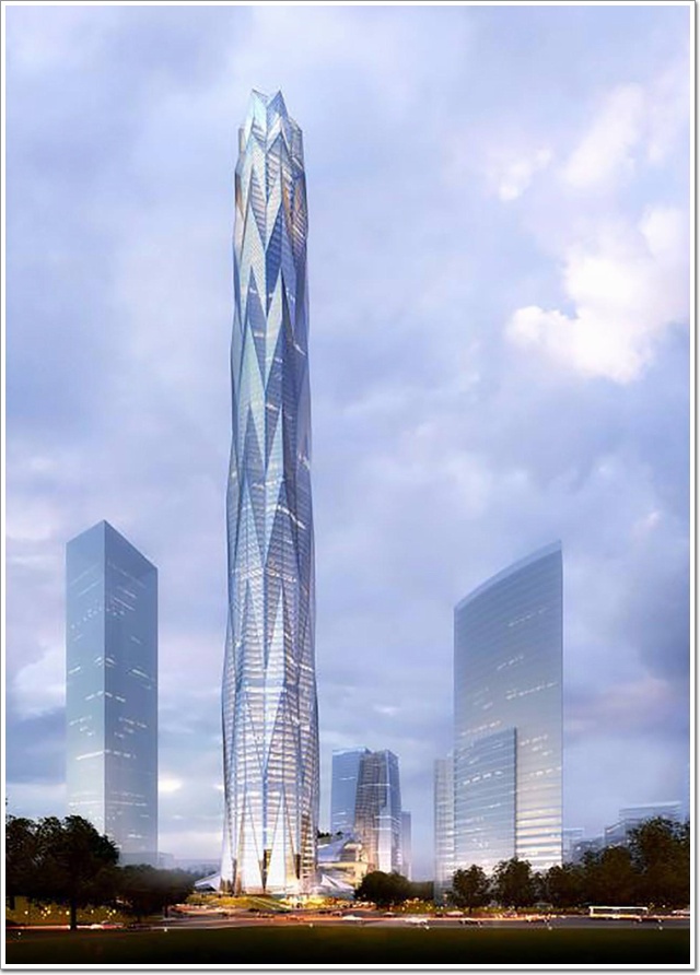 塔樓外立面采用冰晶般的折面肌理,棱面陰陽交錯,指向天空,優雅的逐漸細化尺度。上傾面和下斜面在晴天強光時有效分散陽光直射,在天色陰暗時更似鉆石般漫反射周邊環境光線。隨著天氣、環境和視線角度的變化,塔樓自然演繹出奇妙動感的光效。然而美麗的外表之下,是整個建筑結構體系的設計以及后期幕墻工程施工的極大挑戰。