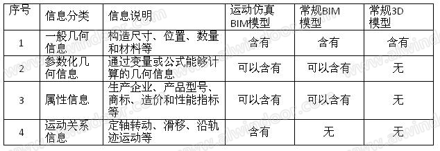 運動仿真BIM模型與常規BIM模型有一定區別,主要表現在信息的承載方面。一般情況下,模型信息可以分為一般幾何信息、參數化幾何信息、屬性信息、運動關系信息等。運動仿真BIM模型與常規BIM模型、常規3D模型的比較見表1。