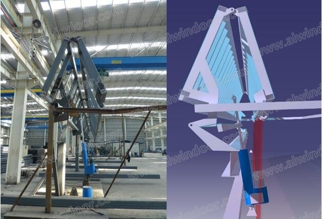 阿布扎比投資委員會新總部大樓位于阿聯酋首都阿布扎比25區。建筑總高度145m,由兩棟25層辦公大樓和裙房組成,是這個地區的獨特的關口和地標性建筑。整個工程的總面積為67500平方米。其中塔樓單元面積34000平米,裙樓9520平米,遮陽傘23980平方米。兩個主樓包含單元及燈帶、遮陽傘。共包含6264樘單元,1000個LED燈及2098個遮陽傘。裙樓包含單元、百葉、石材、亨特板等。其遮陽項目也為世界上最難的新型遮陽項目,能根據需要進行開合變換,采用先進的傳動機構,并采用數字樣機進行模擬,使設計得到進一步優化,最終達到建筑師的設計效果。見圖5。