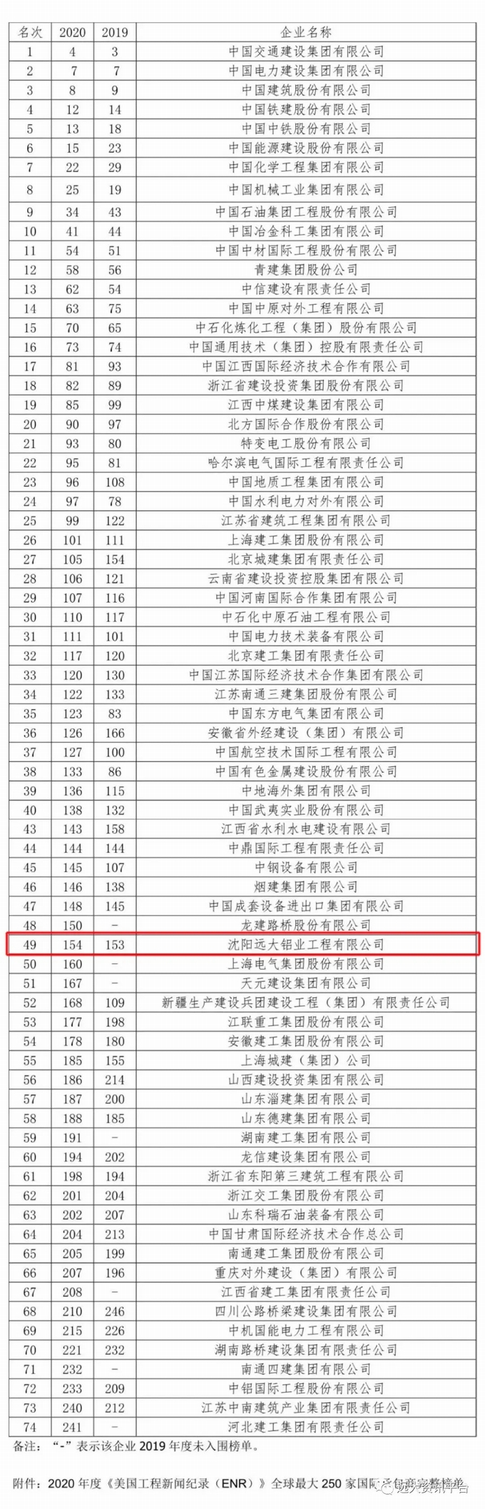 2020年度ENR“全球最大250家國際承包商”上榜中國企業名單如下:
