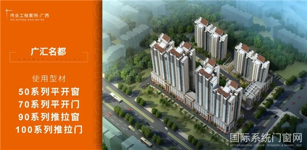 廣匯名都作為廣匯集團首筑江南,禮獻南寧的作品,項目選用偉業集團50系列平開窗、70系列平開門(詞條“平開門”由行業大百科提供)、90系列推拉窗、100系列推拉門系列型材,以品質建筑要求革新人居生活。