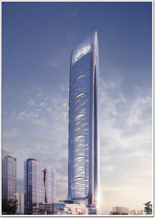 項目由Aedas建筑設計事務所設計,是新城市中心區的大型城市綜合體項目。其設計靈感來源于中國傳統哲學中的天人之道,外觀設計映照中國古箏的曲線和中國長袖舞的靈動,展現了琴弦和舞動雙袖的流線之美。