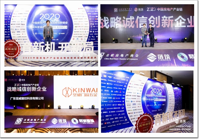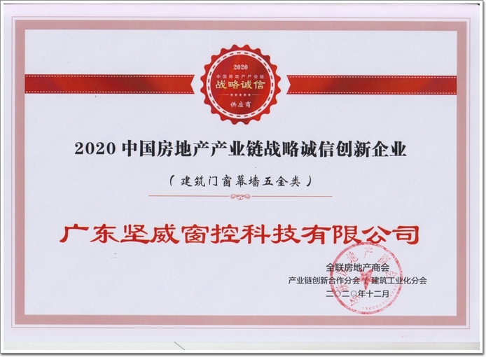 廣東堅威窗控科技有限公司在過去的2020年中,在董事長詹立旺先生的正確帶領下,克服疫情的各種挑戰,不斷推陳出新、科學布局、與時俱進,取得了良好的市場效益及業界口碑,獲得了全聯房地產商會、鏈筑兩會的高度認可,在2020中國房地產產業鏈年度盛典上榮獲了“2020中國房地產產業鏈戰略誠信創新企業”及“2020中國房地產業鏈戰略誠信首選供應商”兩項榮譽稱號。