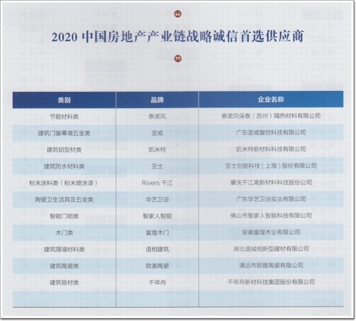 堅威榮獲“2020中國房地產產業鏈戰略誠信首選供應商”稱號