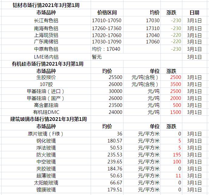 此原材料價格由中國幕墻網收集整理,僅供參考!