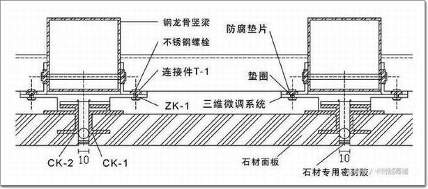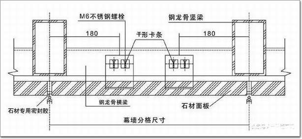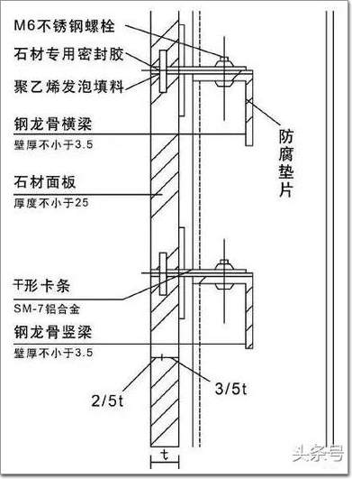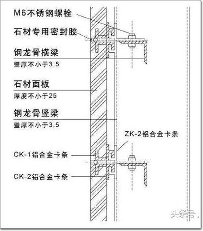 將相鄰兩塊石材面板共同固定在“T”形卡條上,“T”形卡條為不銹鋼或鋁合金,卡條再與骨架固定。但是現(xiàn)在“T”形卡條已經(jīng)被淘汰,只能使用“L”形卡條。