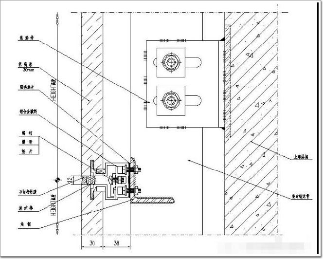 通過(guò)專(zhuān)業(yè)的開(kāi)孔設(shè)備,在石材板棱邊精確加工成一條圓孔,將銷(xiāo)針植入孔中,通過(guò)連接件將石材板固定在龍骨上。主要構(gòu)件(詞條“構(gòu)件”由行業(yè)大百科提供)有銷(xiāo)釘、托板、螺栓、墊板和角鋼,各構(gòu)件的型號(hào)視石材自重、地區(qū)風(fēng)載和地震載荷計(jì)算確定,其結(jié)構(gòu)是:先將角鋼用螺栓固定于骨架或墻體上,并將托板與角鋼固定,石材通過(guò)銷(xiāo)釘與托板連接。該掛件可使板材在小范圍內(nèi)作上下前后調(diào)節(jié),以確保板縫的均勻與板面的平整。由于在石材板棱邊開(kāi)孔,容易崩邊,石材板損耗大,施工工藝復(fù)雜,現(xiàn)已被淘汰,基本不采用。