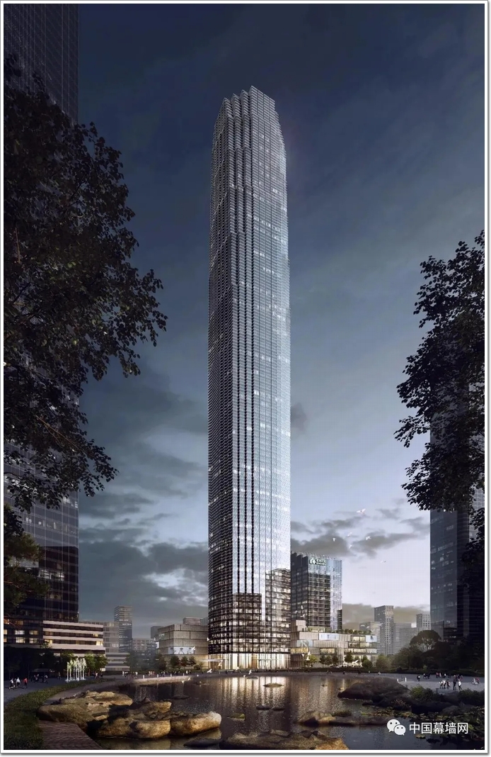 主塔樓采用“橫明豎隱”單元式幕墻系統(tǒng),精致簡(jiǎn)約、大氣磅礴,塔樓上部的退臺(tái)宛如上山階梯蜿蜒瀉下的瀑布,與周邊建筑錯(cuò)落有致,形成一種“眾星捧月”的效果。