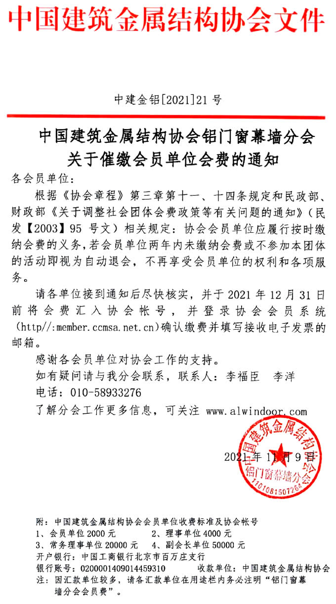 附:中國建筑金屬結構協會會員單位收費標準及協會帳號
