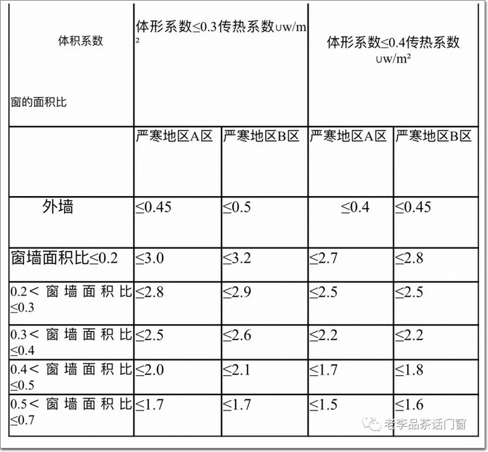建筑體型系數指建筑物表面的面積與建筑物體積之比,即體形系數=∑A/V......(3)建筑物熱損失量與外表的總體積,傳熱系數U值,室內外溫差體積有密切關系。我們知道,對建筑物體積來說,同樣大小的體積,若其長、寬、高尺寸的變化,可得出不同大小的總面積,因而其熱損失就有差別,從節能的角度上就提高了體積系數的要求,也就是說體形系數越大,則單位建筑面積對應的外表面積就越大,傳熱損失就越大。這樣在建筑物熱損失量要求規定值時,若體型系數表越大,U值時要求就得越小,才能滿足要求。2、窗墻面積比對U值得影響由于窗和墻的傳熱系數相差較大,故對窗墻面積的不同比例對窗的U值就有不同要求,也就是說窗墻面積比越大,則對窗的U值要求就越小,以減少熱損失,見下表