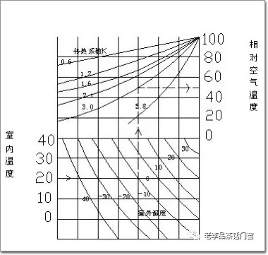 室內窗表面溫度的計算公式為:T=Ti-RiU(Ti-To),當室內窗表面溫度計算值T大于室內結露點溫度時,可判定為室內窗表面不會結露,否則會產生結露。例2:若室外溫度To=-24℃,室內溫度Ti=20℃。窗的傳熱系數U=2.5w/m².k,室內相對濕度RH=40%時,試判定窗內表面是否結露。帶入上式:T=20-0.125×2.5×(20+24)=6.25℃,根據例1的計算室內一般結露點為6℃,而本例計算出室內窗表面的溫度為6.25℃,大于6度故按上述參數設計窗的內表面不會結露。
