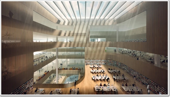 圖書館內部,垂直錯落的開放式閱覽空間圍繞著一個大型中庭布局,它們連接著圖書館的不同功能區域,自然光通過環繞建筑物的燒結玻璃帶和中央中庭上方的大天窗充滿室內。三間交錯排列的閱覽室圍繞著中庭布置,低矮的墻壁和開放式座椅提高了透明度(詞條“透明度”由行業大百科提供)和空間感。彎曲的木墻、書架和地板給現代室內帶來溫暖的感覺。