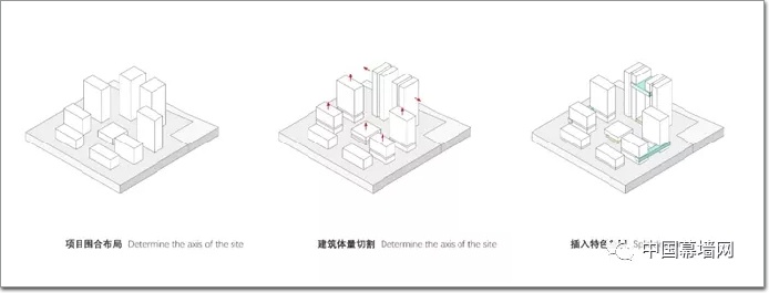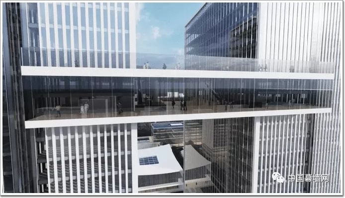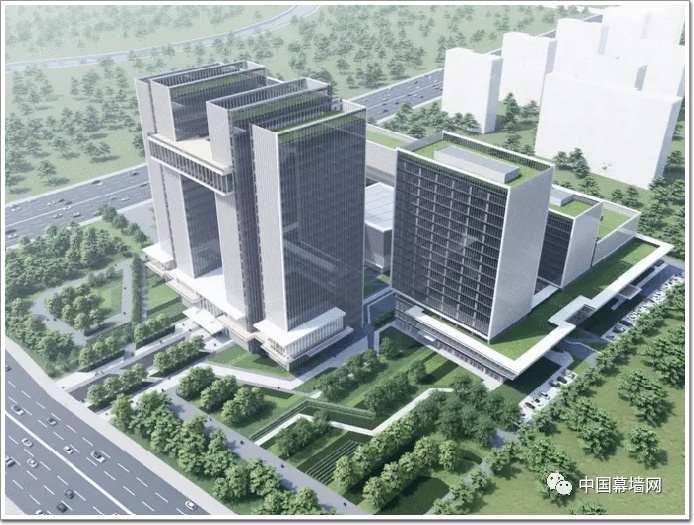 整體建筑群呈南高北低,充分考慮了周邊居住建筑的日照,與周邊的城市地貌相融合。建筑總體高度控制在100米以內,為方便使用多數建筑以連廊相互連接。在整體立面設計上以簡潔的豎向線條為主,突出建筑的挺拔,通過線條在各個方向立面上的變化形成層次。在近人尺度上,通過現代簡潔的建筑設計手法呼應中國傳統建筑中的“斗拱”,讓建筑擁有細節。