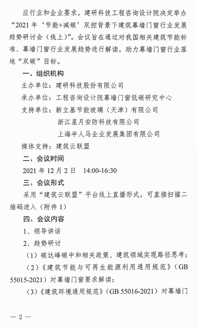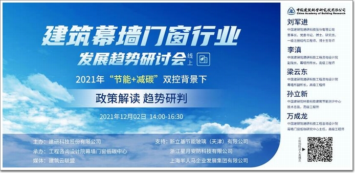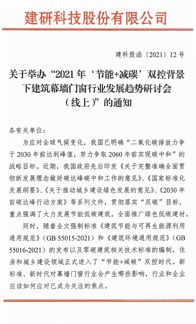 應行業和企業要求,建研科技工程咨詢設計院決定舉辦“2021年‘節能+減碳’雙控背景下建筑幕墻門窗行業發展趨勢研討會(線上)”。會議旨在通過對我國相關建筑節能標準、幕墻門窗行業發展趨勢進行解讀,助力幕墻門窗行業落地“雙碳”目標。