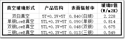 真空玻璃至少應(yīng)有一片玻璃是低輻射玻璃。由于真空玻璃中心部位的傳熱在很大程度上通過輻射實現(xiàn),所以是否使用LowE玻璃,甚至LowE玻璃表面輻射率的差異,都會對真空玻璃的隔熱性能造成很大影響。見以下數(shù)據(jù)。