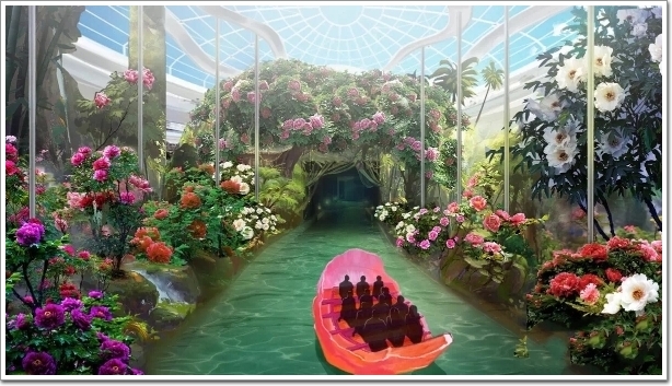 其中,“花舞世界”項目主體場館內主要包括情景漂流、球幕影院和數字科技的運用:實景漂流+主題演繹秀結合,每個花瓣造型為弧幕投影,影片為5段關于牡丹的傳說故事,觀眾坐在旋轉座椅上通過軌道移動身臨其境感受牡丹傳說;花舞牡丹情景互動影院,充分利用天頂的空間制作機械模型,配合4D座椅的特效帶給游客多方位的體感襲擊。