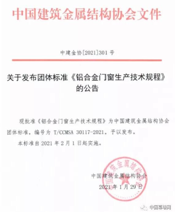 團體標準《鋁合金門窗生產技術規程》(T/CCMSA 30117-2021)已經順利完成編制工作,于2021年1月29日獲得批準,2021年2月1日正式發布實施。