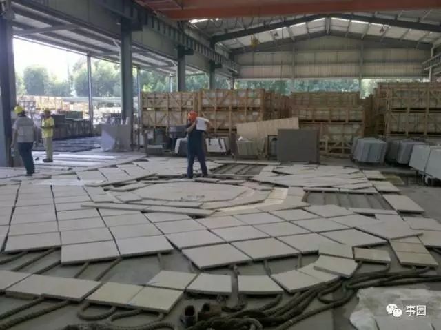 ▲石材切好之后,進行排版編號,現場鋪裝根據工廠編號鋪設精度更高。