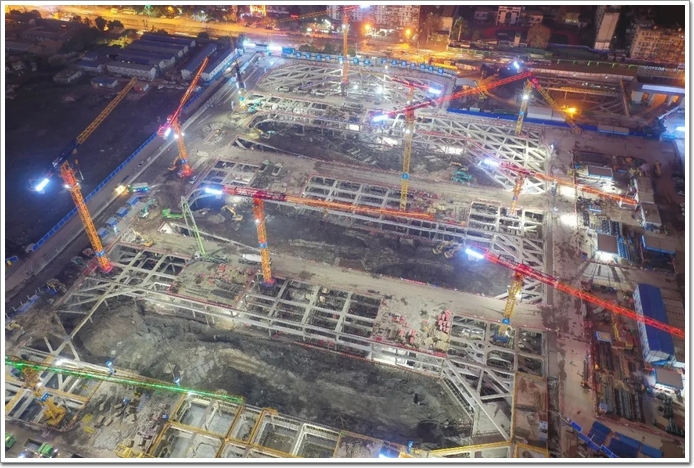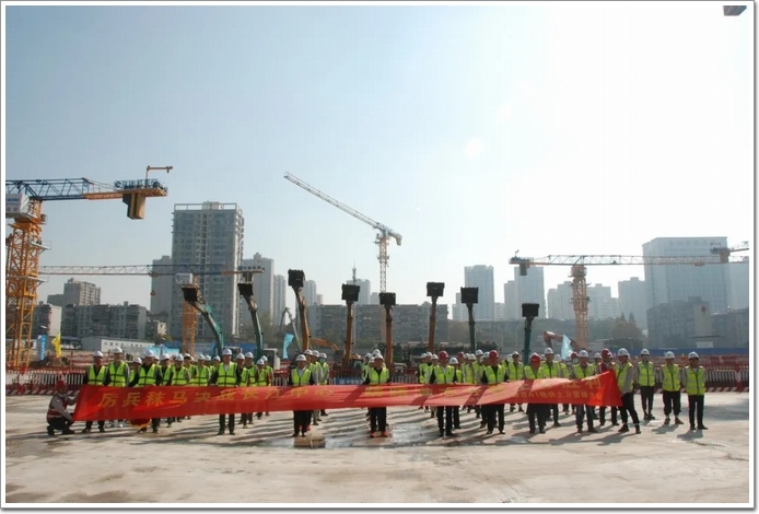 A1地塊自10月19日全部進場后,日夜奮戰,燈火通明,大干15天完成10臺塔吊安裝及首道內撐全部完工,于12月19日,提前2個月完成3層角撐約3600噸鋼筋綁扎、約24000m³混凝土澆筑。