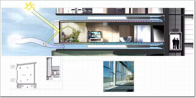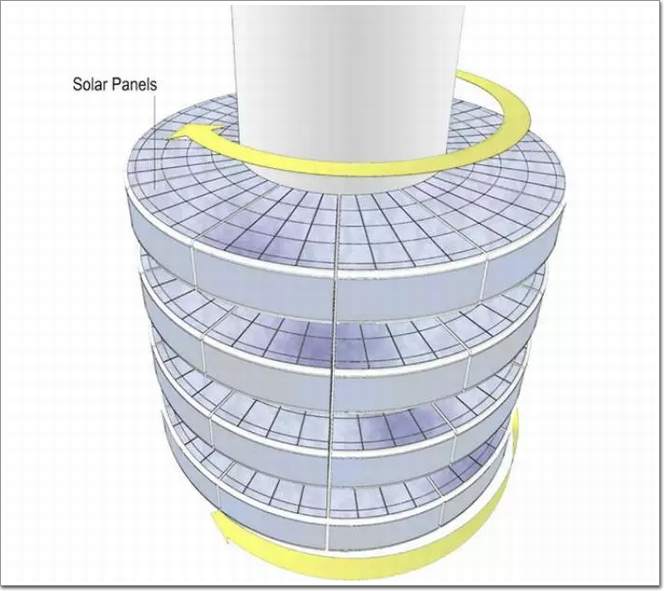 它也是第一個自己給自己供電的大樓。在每一層的屋頂都有太陽能板產生能量,為大樓供電。