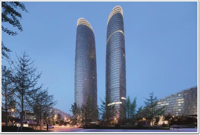 成都交子金融城雙塔,又叫天府國際金融中心,由法國著名的保羅·安德魯巴黎建筑事務所與中建西南院聯合設計。項目位于成都市金融城核心區域,高218米,總建面約16萬平方米,整體布局呈放射性花瓣散開,呈現現出簡約、優雅、現代的總體風貌。項目共由9幢建筑組成,分別為6幢“花瓣”建筑,和一幢“花蕊”建筑,以及兩幢超高層建筑。
