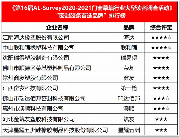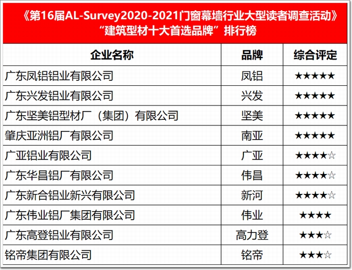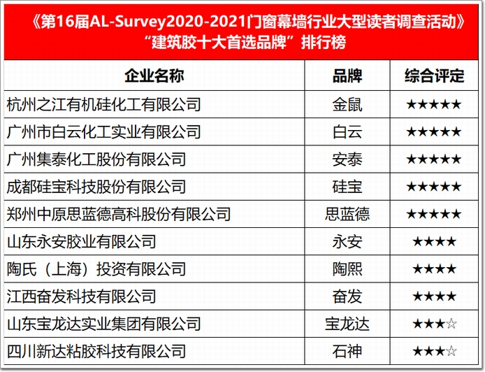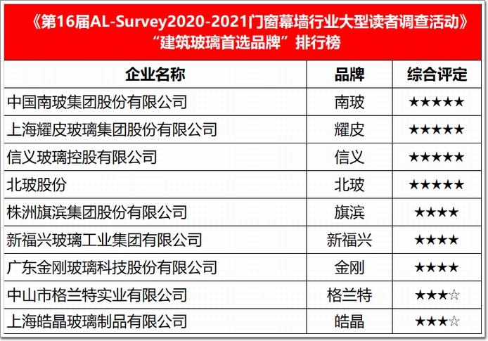 權威的行業榜單|AL-Survey組委會按照歷年來通行的評價體系,透過網絡投票驗證企業“人氣值”等級、專家口碑評價+設計院品牌選用“推薦度”評分,地產公司+施工單位產品應用“滿意度”打分,以及本屆特別增設的“友商互評”等環節,最終評選出了本屆的“我最喜愛幕墻工程”以及門窗首選品牌、建筑膠首選品牌、五金首選品牌、型材首選品牌、玻璃首選品牌、加工設備首選品牌、隔熱條首選品牌、密封材料首選品牌等八大類獎項,共計71家獲獎企業(品牌),以及15項年度代表工程,加冕“我最喜愛幕墻工程”榮耀。