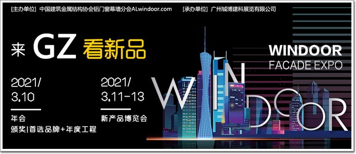 由中國建筑金屬結(jié)構(gòu)協(xié)會鋁門窗幕墻分會創(chuàng)辦,中國房地產(chǎn)業(yè)協(xié)會、中國房地產(chǎn)與門窗幕墻產(chǎn)業(yè)合作聯(lián)盟共同主辦的“2021全國鋁門窗幕墻新產(chǎn)品博覽會”于2021年3月11日在廣州保利世貿(mào)博覽館盛大開幕!