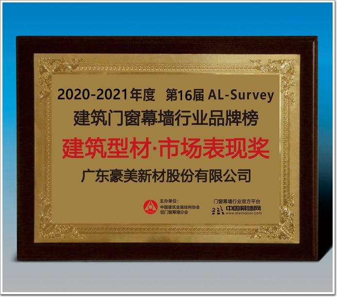 豪美新材作為中國鋁型材上市企業(yè)(股票代碼:002988),憑借著強(qiáng)大的市場營銷能力,過硬的產(chǎn)品質(zhì)量,完善的服務(wù)體系,以及良好的業(yè)界口碑,實力榮獲2020-2021年度中國門窗幕墻行業(yè)品牌榜——“市場表現(xiàn)獎”。