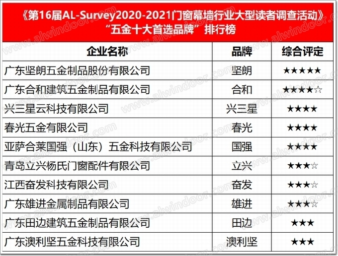 根據2020-2021年行業統計調查數據,評選出的年度“建筑五金十大首選品牌”榜單。